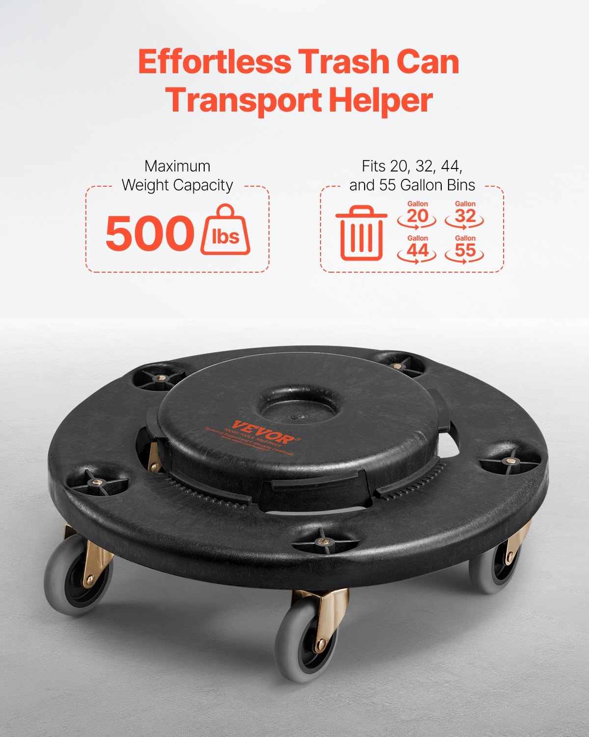 Weight Capacity: 500 lbs / 227 kg,Compatible Bin Capacity: 20, 32,44, and 55 Gallon,Color: Black,Item Model Number: XDW-007-C,ProductWeight: 8.2 lbs / 3.7 kg,Quantity: 2 Pieces,Product Dimensions: 18"× 6.1" / ⌀455 × 155 mm,Main Material: PP (Polypropylene)