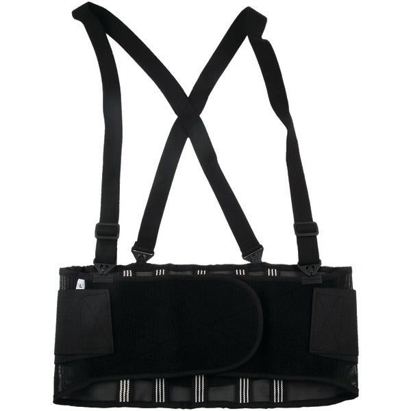 • Made from economical 280D stretchable spandex with mesh on backside for air flow;• Nonconductive polypropylene stays for long-lasting integrity;• Adjustable, detachable suspenders keep belt in place and on standby before next lift;• Rubber track webbing stays keep support in place and prevents riding up;• Power panels offer instant snug activation before lifting;• Low-profile hook-and-loop closure makes it easy to use over or under clothing;• Machine wash cold; air dry;• Large; fits waists with a 34 in. to 38 in. circumference;